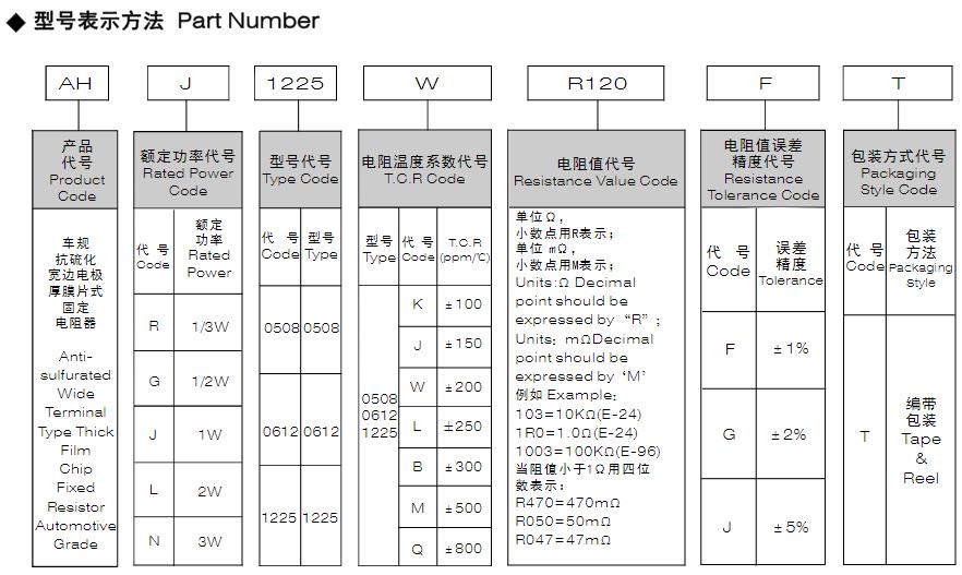 風(fēng)華高科車規(guī)抗硫化寬邊電極厚膜片式固定電阻器型號命名規(guī)則: