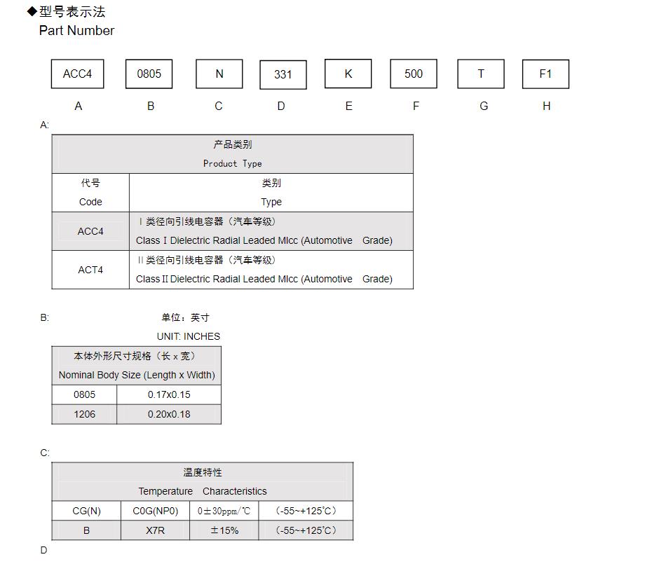 風(fēng)華高科車規(guī)徑向引線多層陶瓷電容器型號命名規(guī)則: