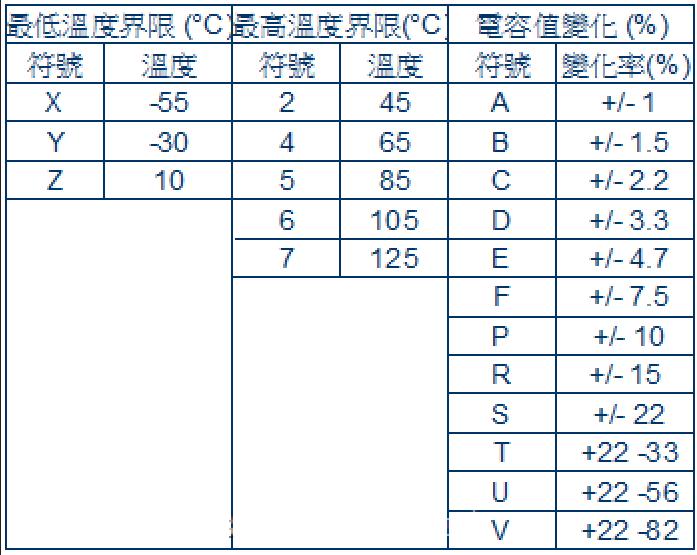 X7R : 表示-55°C(X)~125°C(7)其容量變化(以25°C為基準)必須 ±15%(R) 以內。