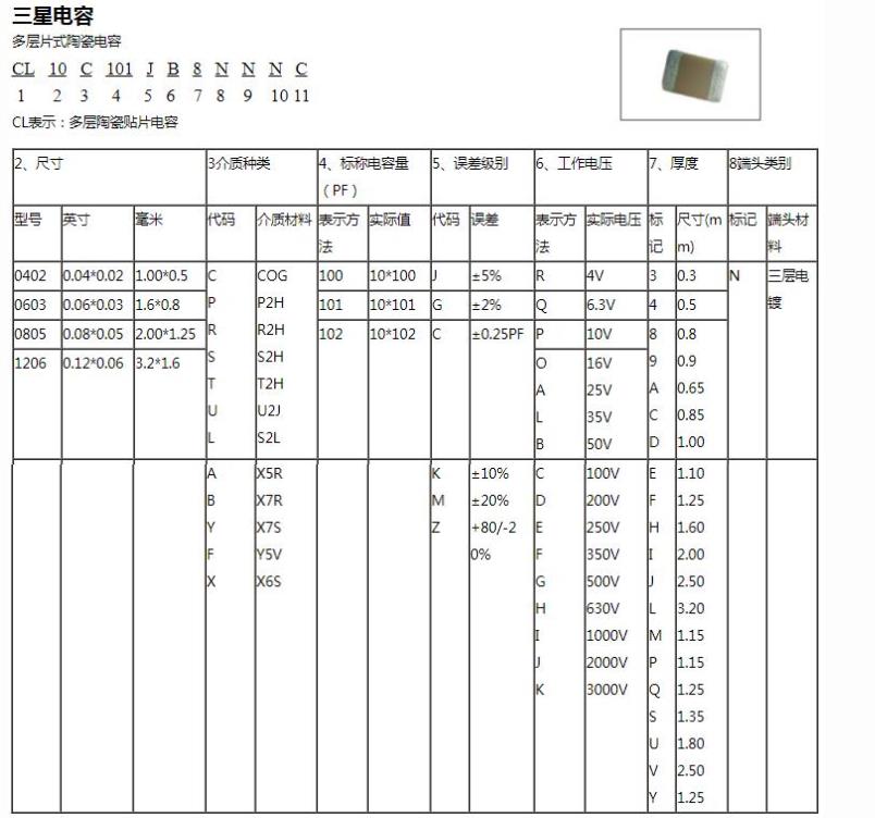 三星貼片電容物料編碼識別規則對照表