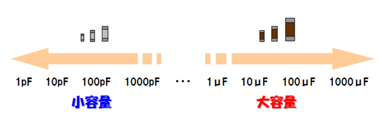 在陶瓷電容器使用的范疇里內,F單位已經過大,因此常使用μF(微法、法拉的100萬分之一)、pF(皮法、法拉的1兆分之1)單位。根據使用的地方、狀況的不同,基準也不同,但陶瓷電容器在1μF以上時就稱為大容量,低于1000pF時稱為小容量。