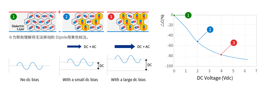 像Class2 產品,電介質內的 Dipole在加 DC 電壓后,會按照電壓所處的方向整齊排列,當所加的 DC 電壓變大,因 DC 電壓而固定方向的 Dipole也會增加。MLCC的容量由對 AC 電壓做出反應的 Dipole決定,由DC 電壓固定的 Dipole越多對 AC 電壓做出反應的 Dipole 就會越少,從而導致容量下降。