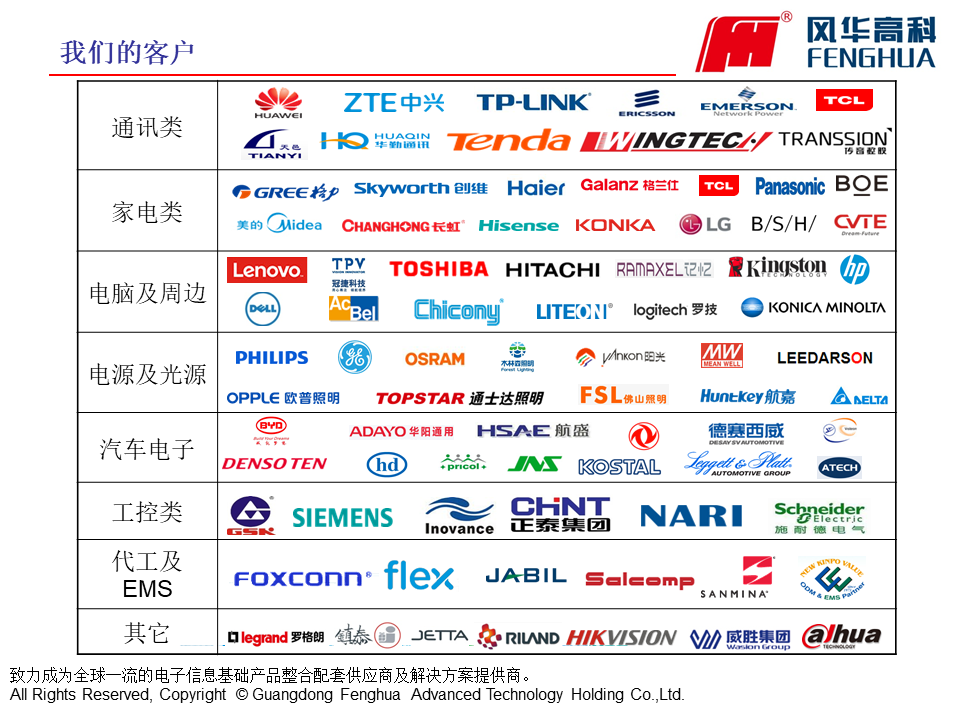 風華高科具有完整與成熟的產(chǎn)品鏈,具備為通訊類、消費類、計算機類、汽車電子類、照明電器類等電子整機整合配套供貨的大規(guī)模生產(chǎn)能力。
