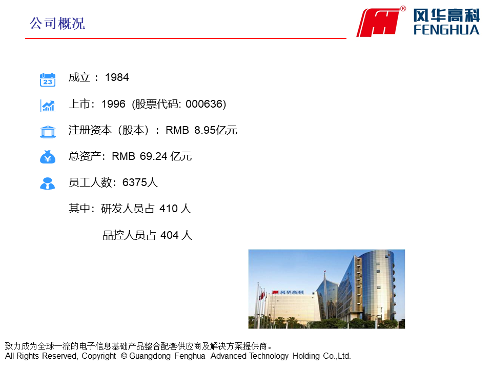 廣東風華高新科技股份有限公司(證券簡稱風華高科,證券代碼000636)成立于1984年,是一家專業(yè)從事高端新型元器件、電子材料、電子專用設備等電子信息基礎(chǔ)產(chǎn)品的高新技術(shù)企業(yè),1996年在深圳證券交易所掛牌上市。風華高科自進入電子元器件行業(yè)以來,實現(xiàn)了跨越式的發(fā)展,現(xiàn)已成為國內(nèi)最大的新型元器件及電子信息基礎(chǔ)產(chǎn)品科研、生產(chǎn)和出口基地,擁有自主知識產(chǎn)權(quán)及核心產(chǎn)品關(guān)鍵技術(shù)的國際知名新型電子元器件行業(yè)大公司。