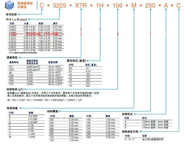 大家好,我是超翔小編,今天給大家介紹TDK貼片電容命名規則,以下內容由小編整理,相關內容供以參考。TDK的電容,料盤上會有TDK字樣的標示。分上下兩個標,上標是小標,下標是大標。TDK貼片電容的參數一般由: 系列名稱,體積,材質,電壓,容量,誤差,包裝組成。例如:C 3225 X7R 1H 106 M 250 A C系列名稱:字母C表示。體積是由公制表示:0603=0201;1005=0402;1